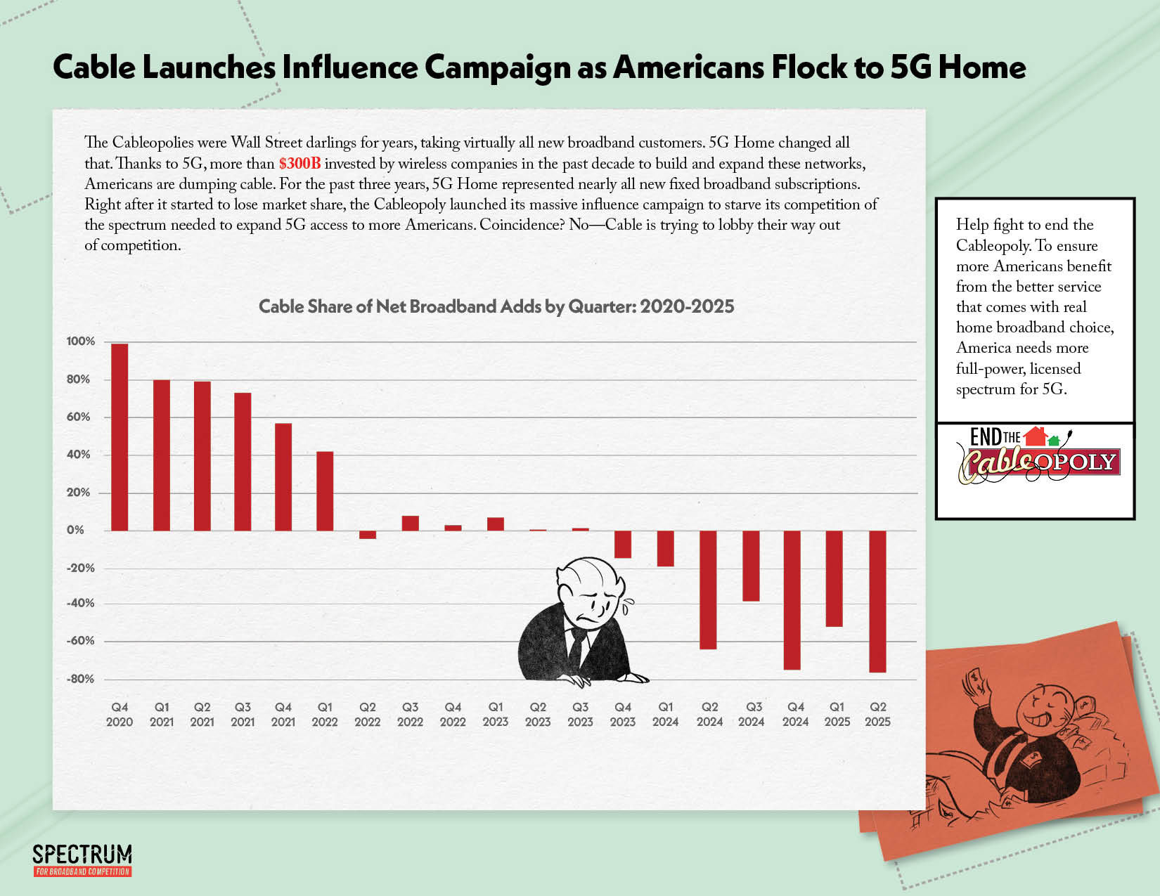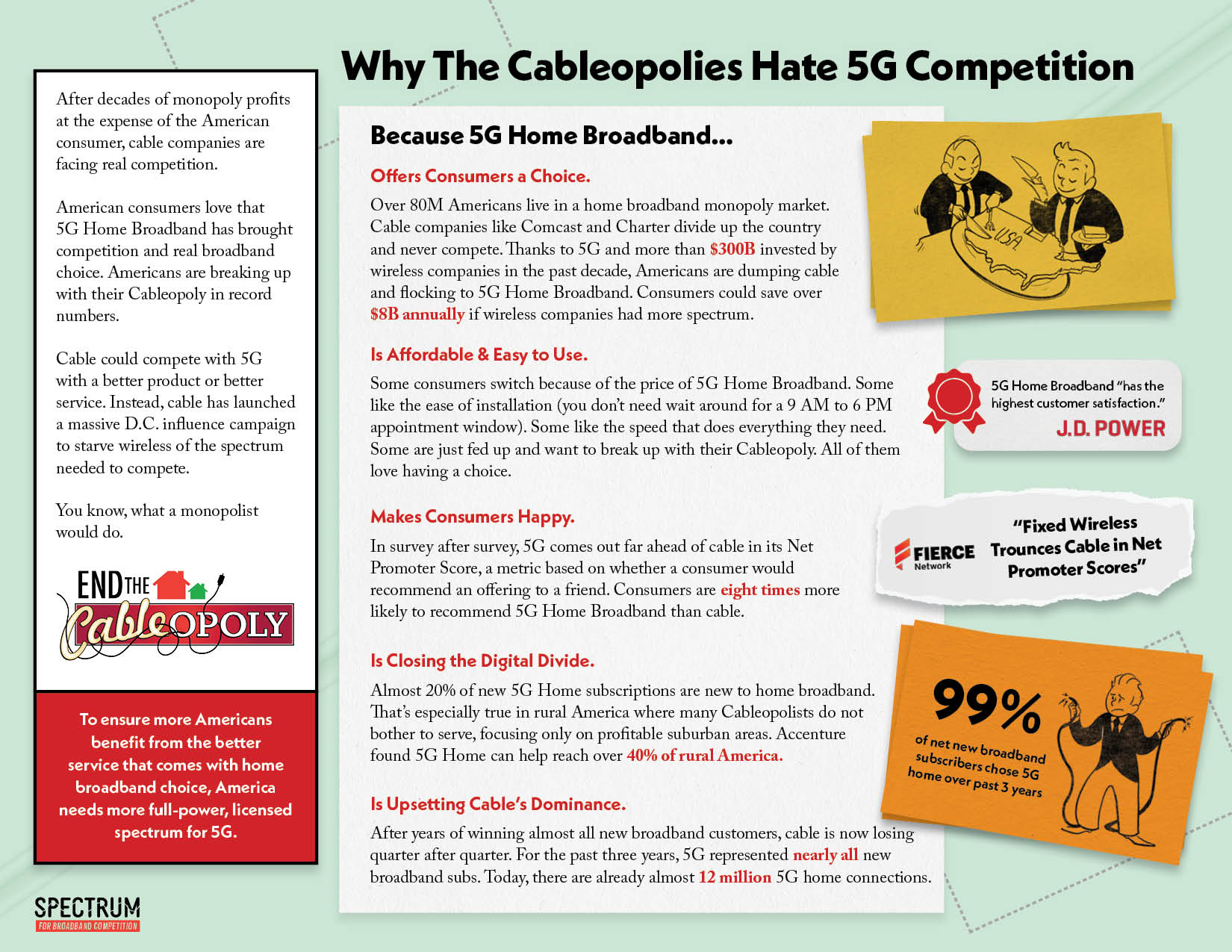 One Pagers Why the Cableopolies Hate 5G Competition Cable Launches Influence Campaign as Americans Flock to 5G Home Seeing Through Cableopoly's Spectrum Demands The Cableopoly Admits They Don't Need More Spectrum 5G Home Crushes Cable in Net Promoter Score Independent Investigation Shows the Cableopoly Isn’t Using CBRS Spectrum Debunking Cable's Big Money Influence Campaign Cable's Wi-Fi Whopper Cable's Spectrum Piggybacking Scheme Reports and White Papers Competitive Effects of Fixed Wireless Access on Wireline Broadband Technologies